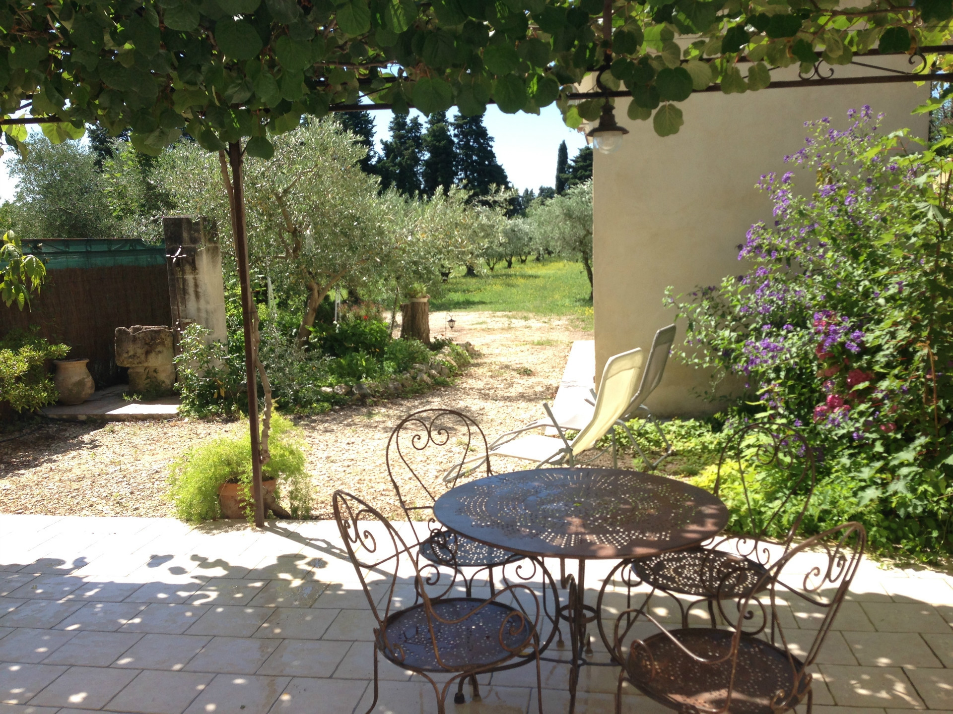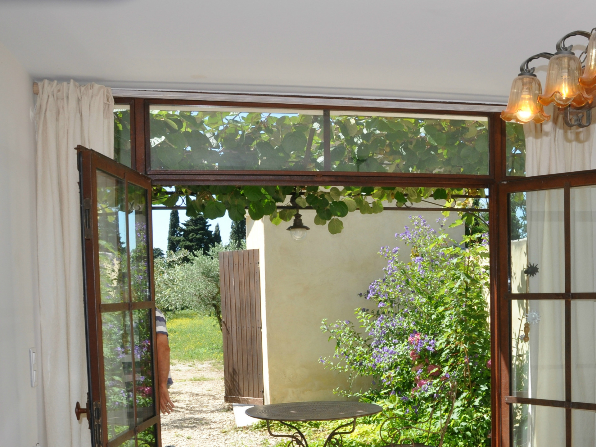 À l'ombre d'un kiwi qui court sur la tonnelle, en campagne, au coeur des oliviers, dans un Mas Provençal du village de Saint Pierre de Mézoargues.