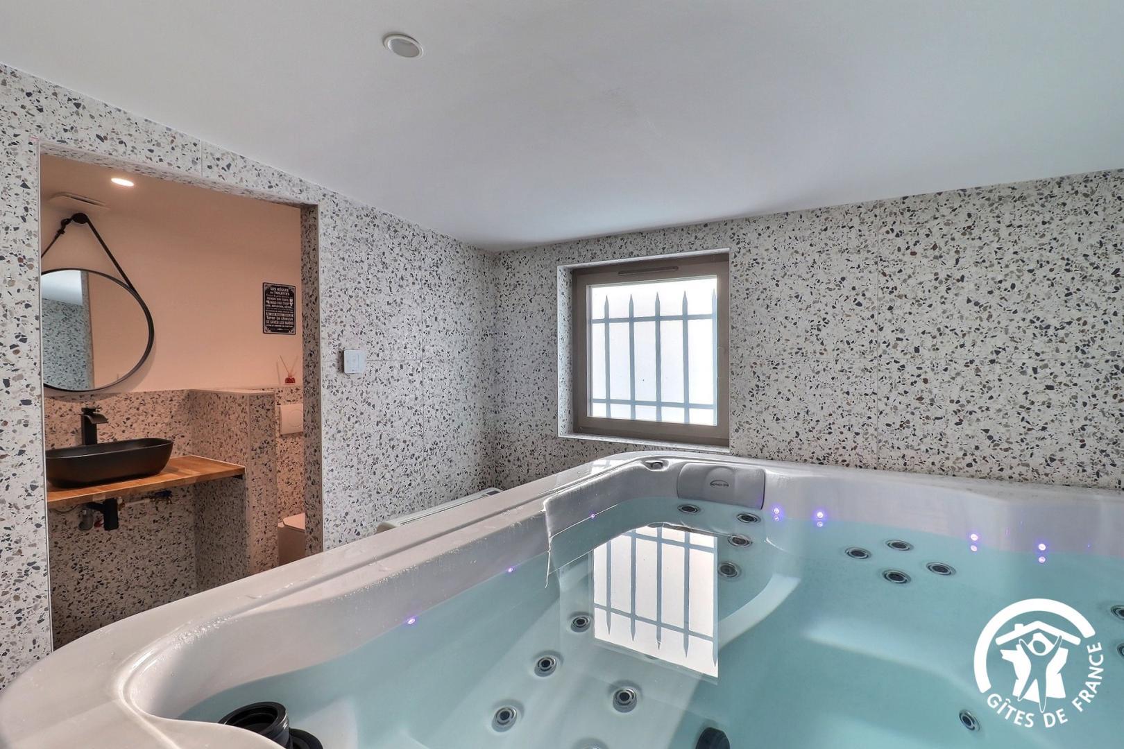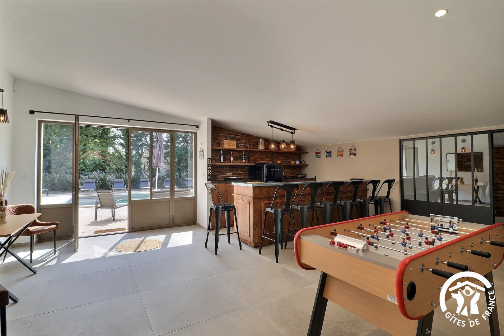 Le rez-de-chaussée vous accueille avec un grand espace de vie lumineux comprenant une cuisine entièrement équipée, un salon avec bar, babyfoot, fléchettes, ainsi qu'un espace bien-être avec spa et une salle de sport.