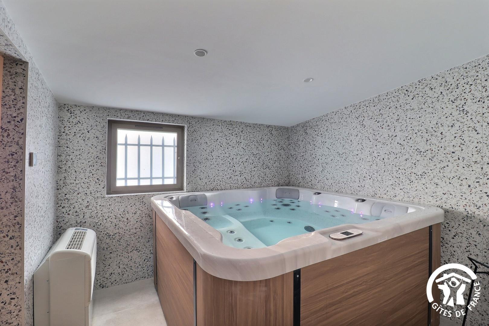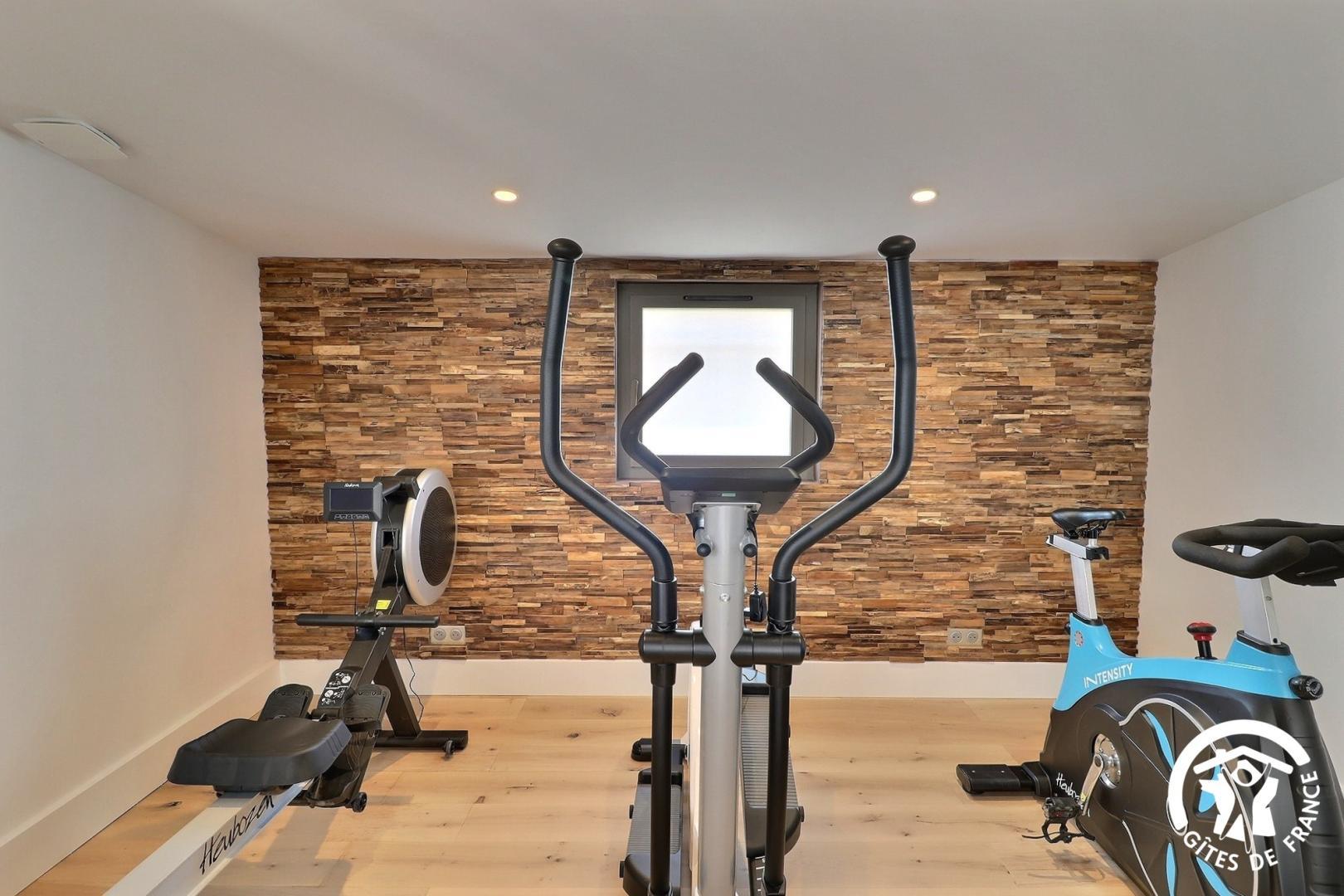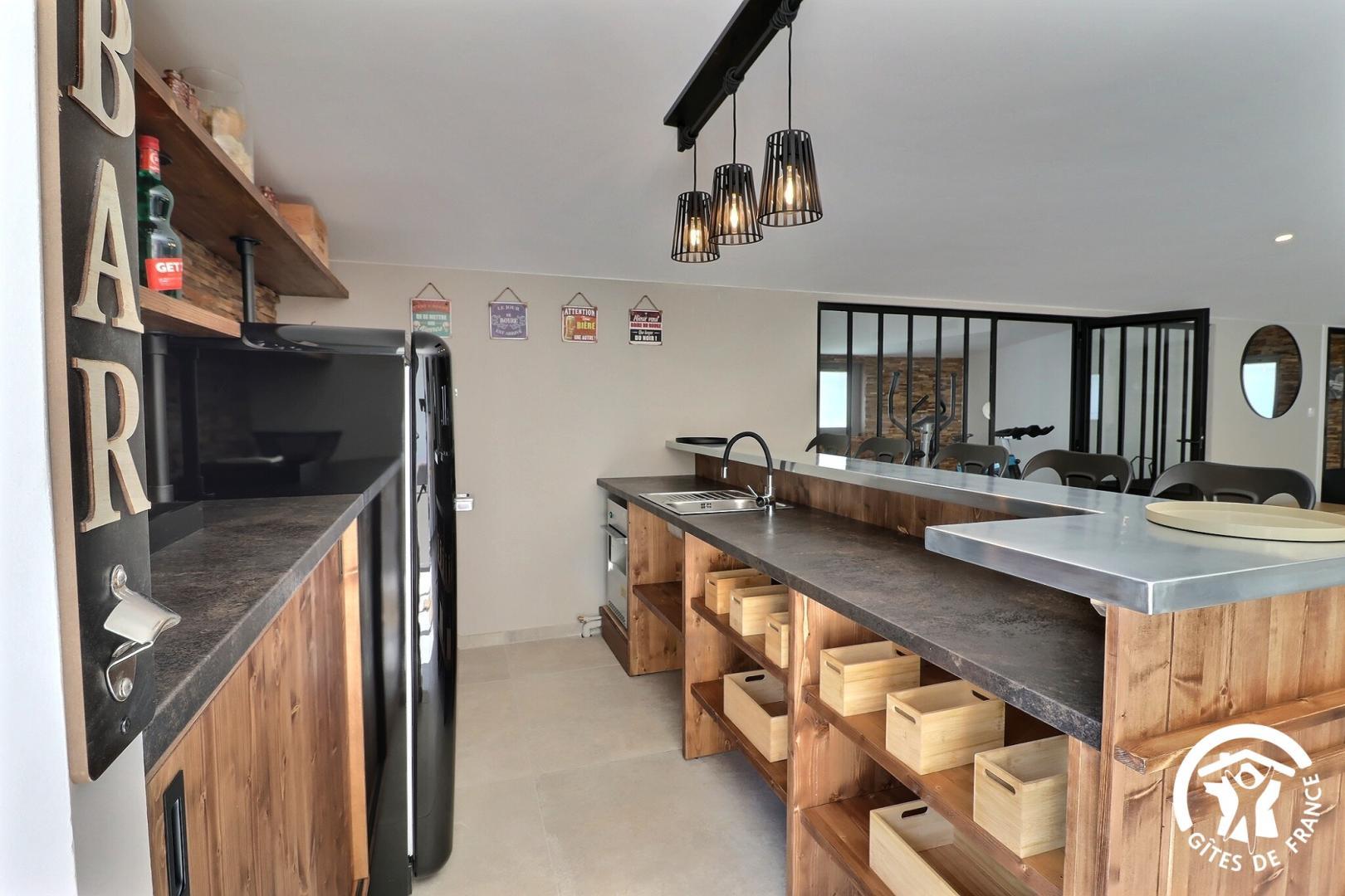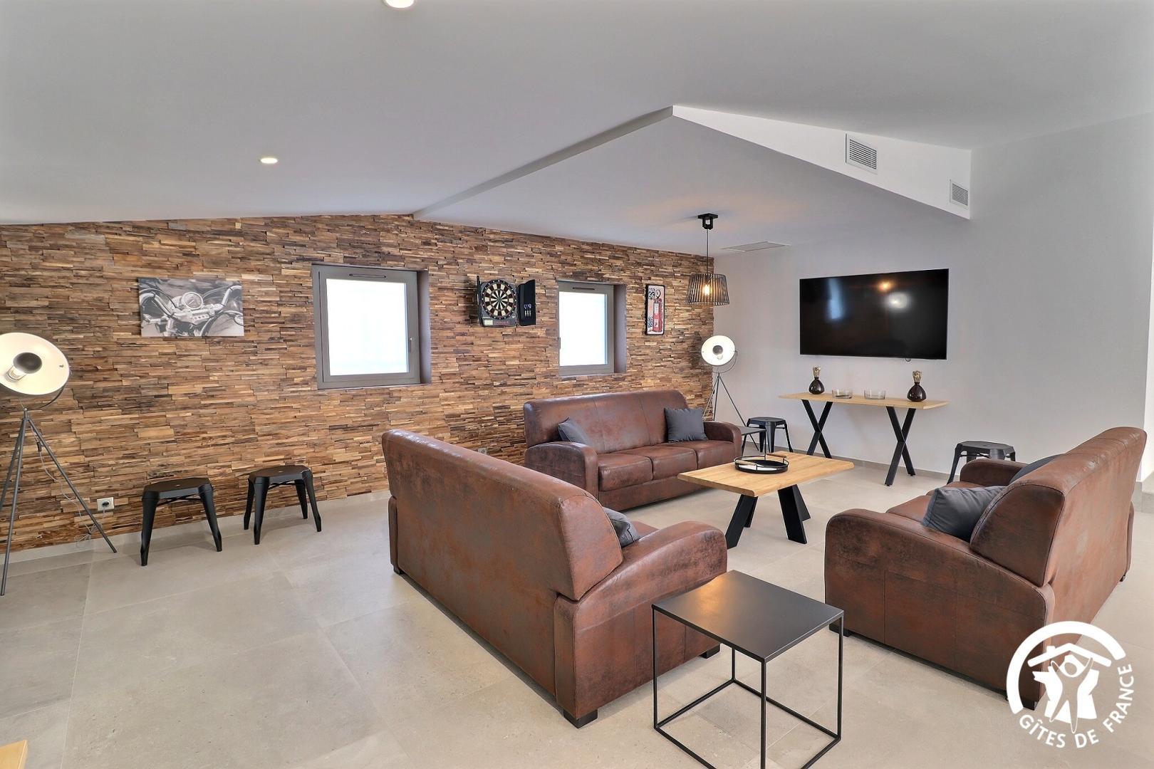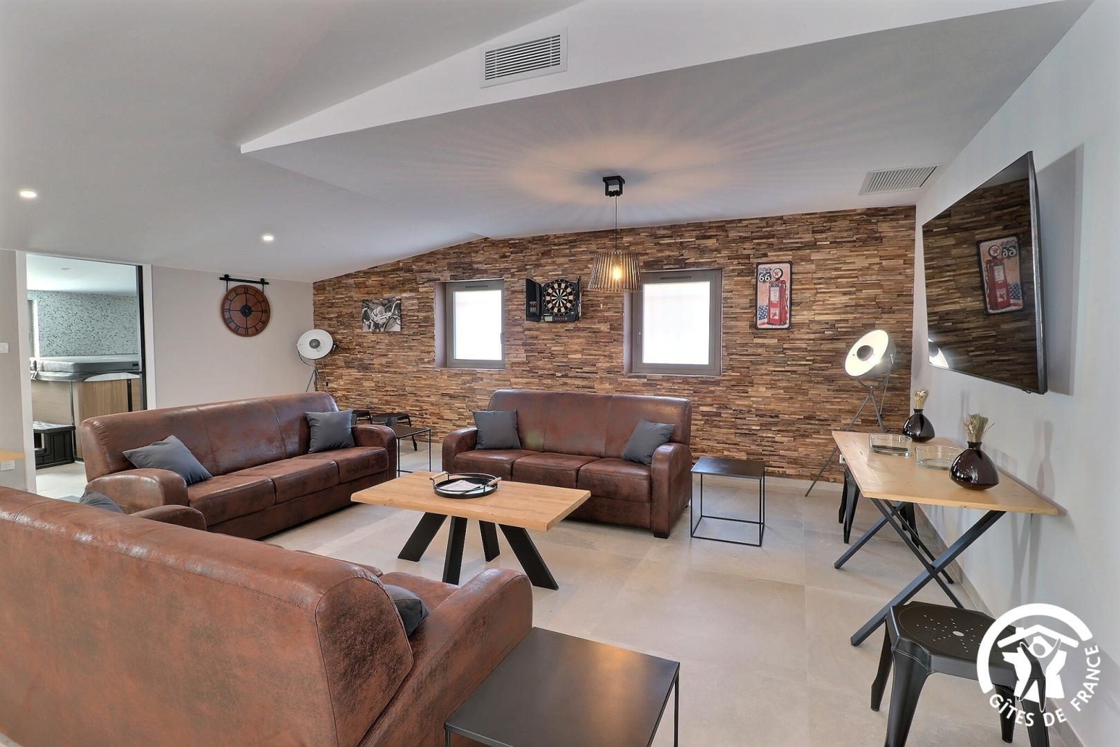 Le rez-de-chaussée vous accueille avec un grand espace de vie lumineux comprenant une cuisine entièrement équipée, un salon avec bar, babyfoot, fléchettes, ainsi qu'un espace bien-être avec spa et une salle de sport.