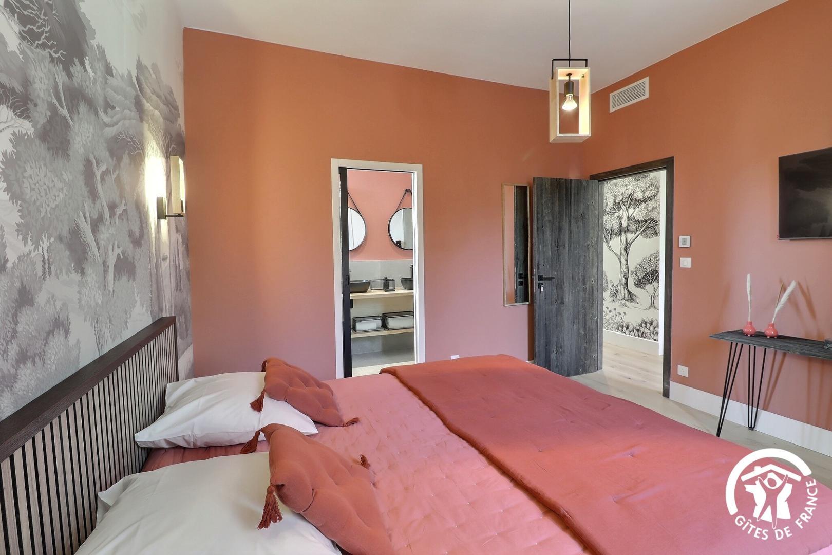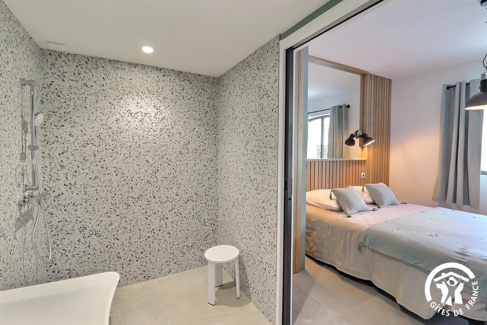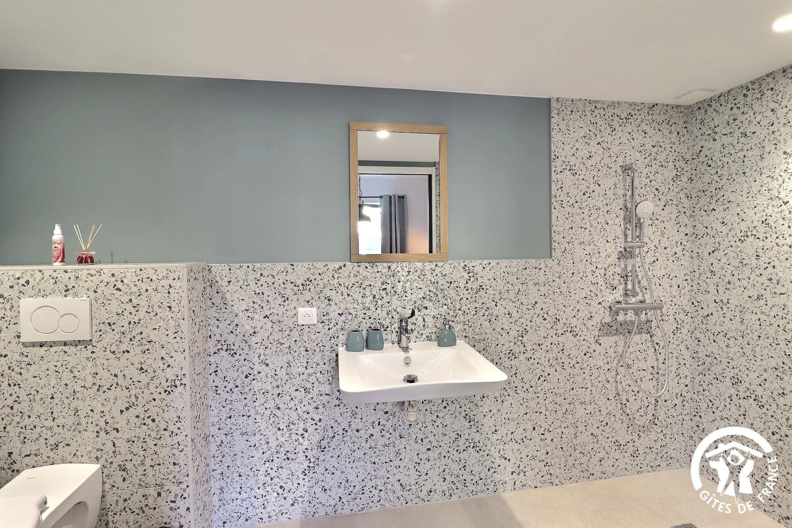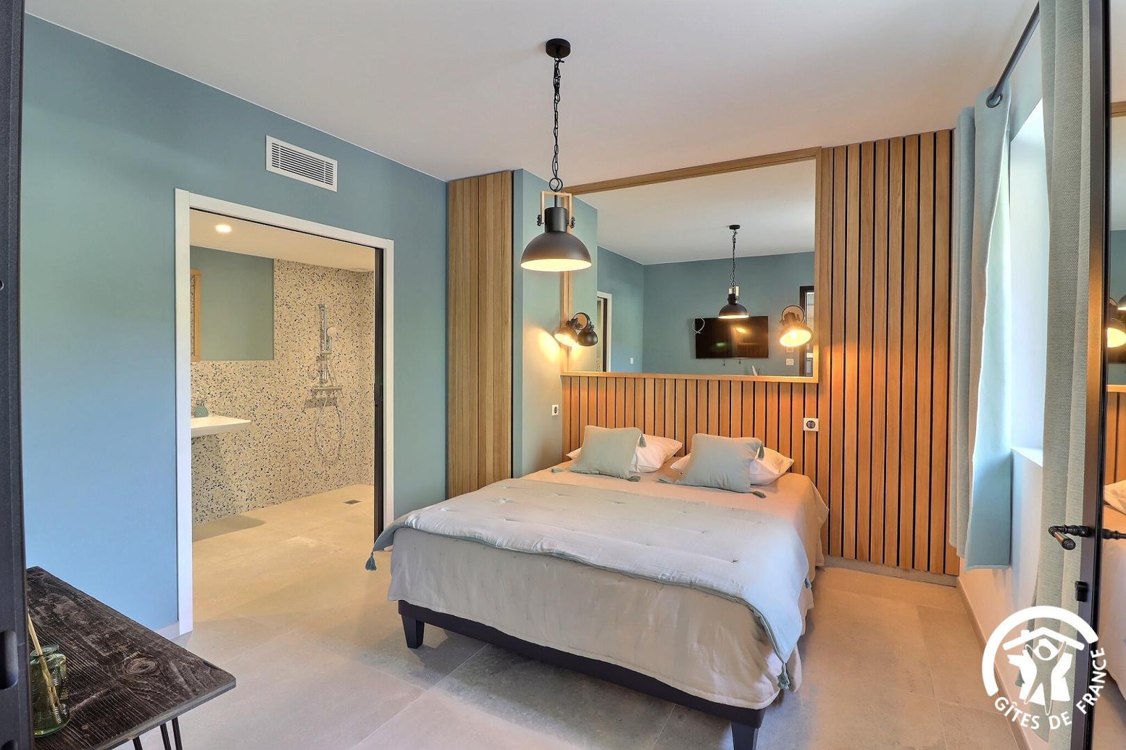 Une chambre de plain-pied est aménagée pour l'accessibilité PMR, avec sa salle d'eau et WC privatifs.