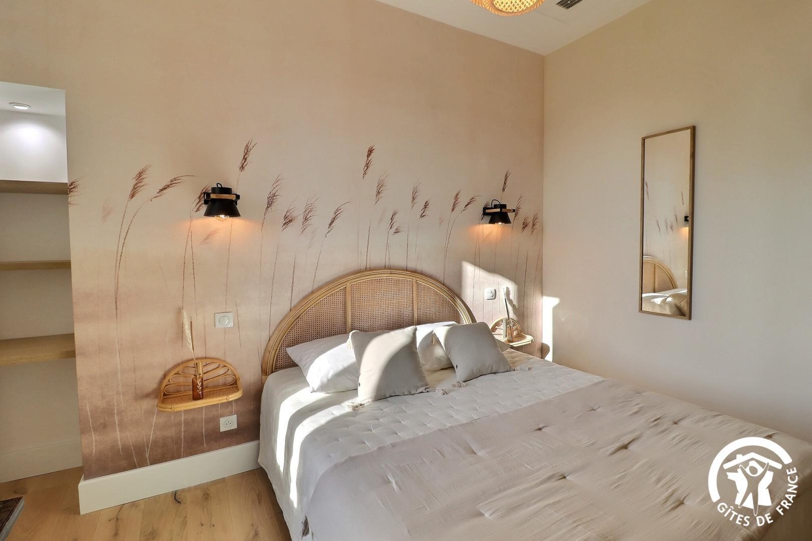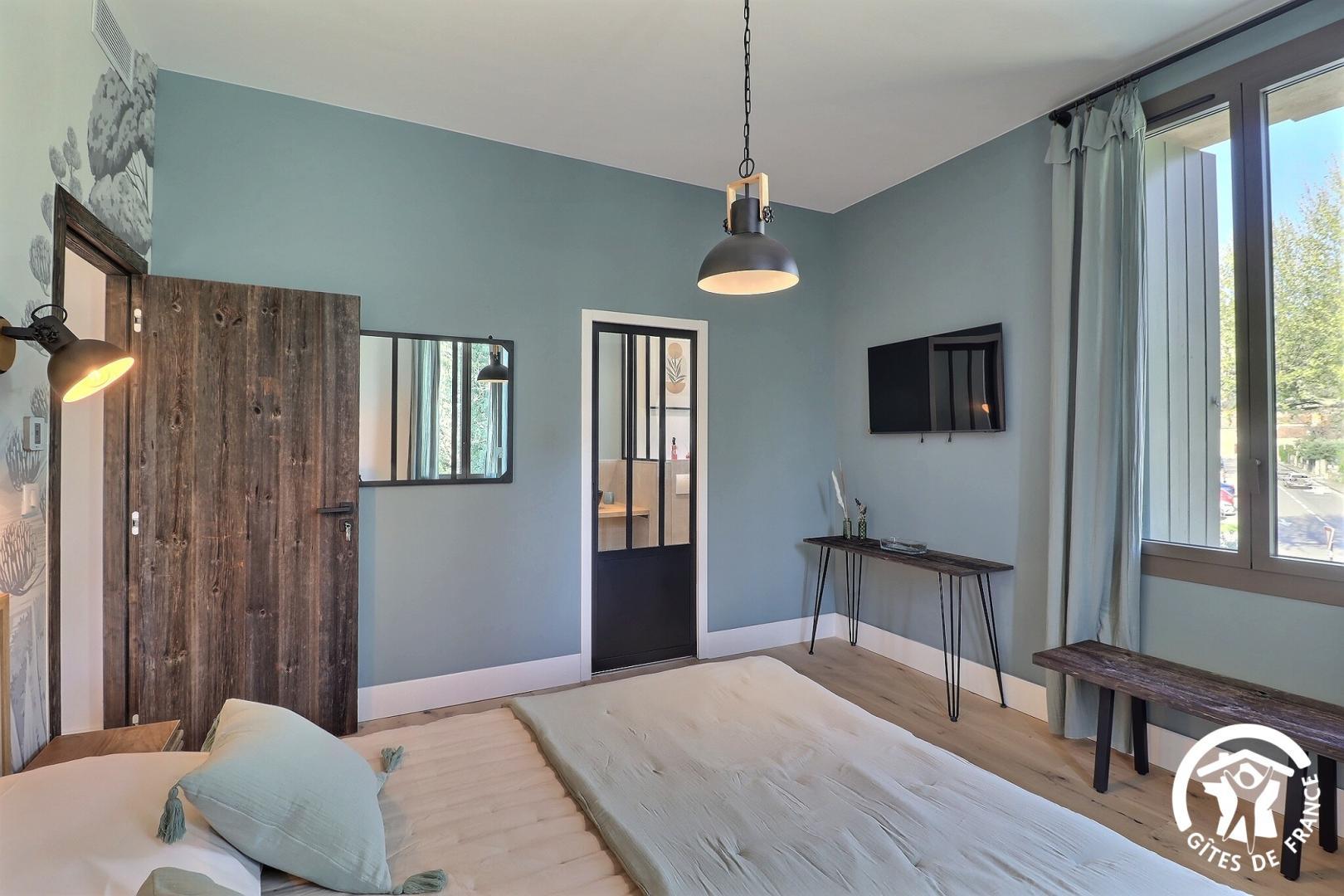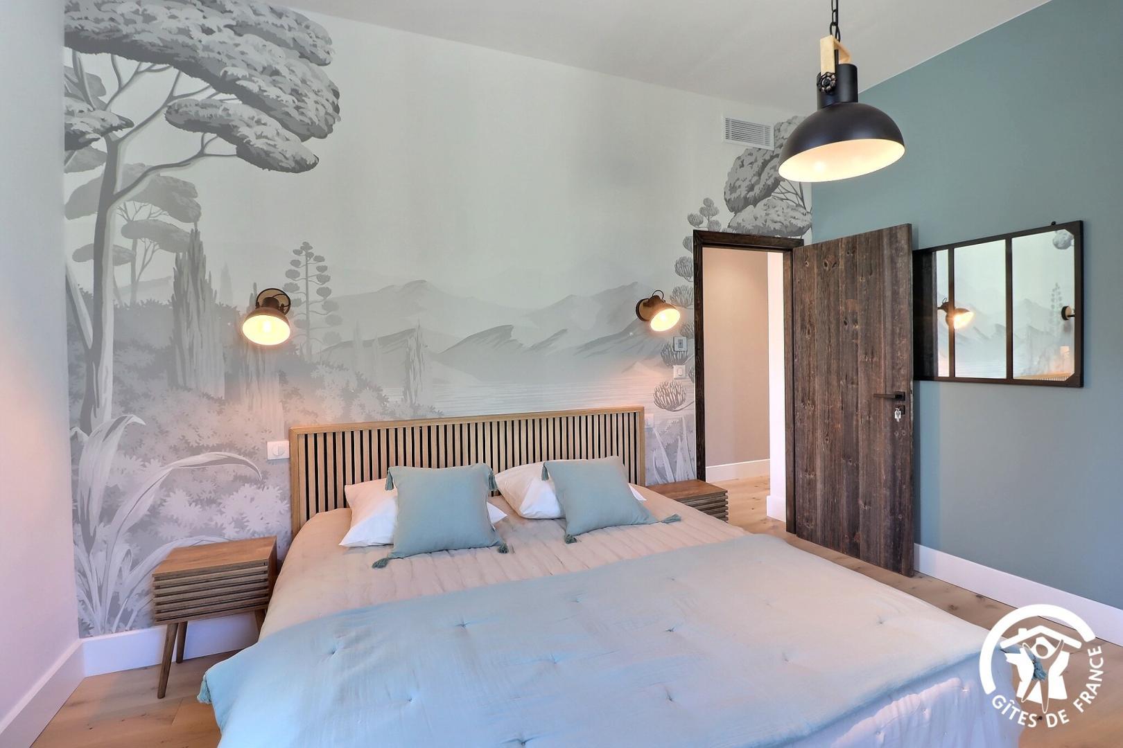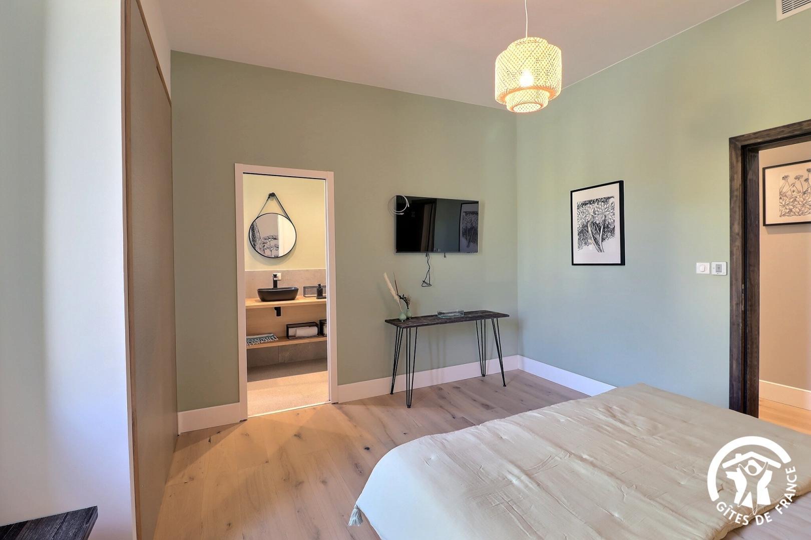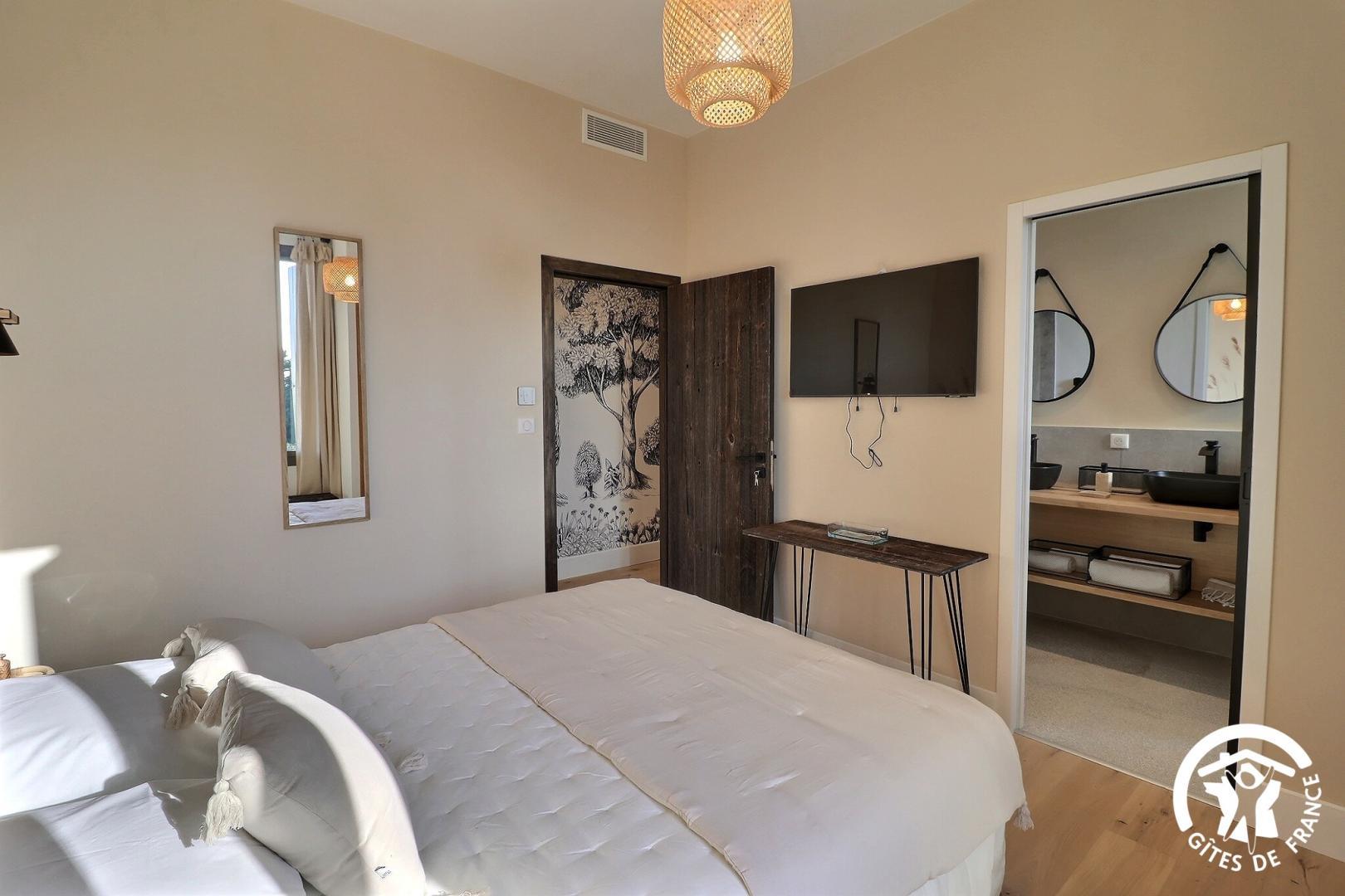 Une chambre de plain-pied est aménagée pour l'accessibilité PMR, avec sa salle d'eau et WC privatifs.