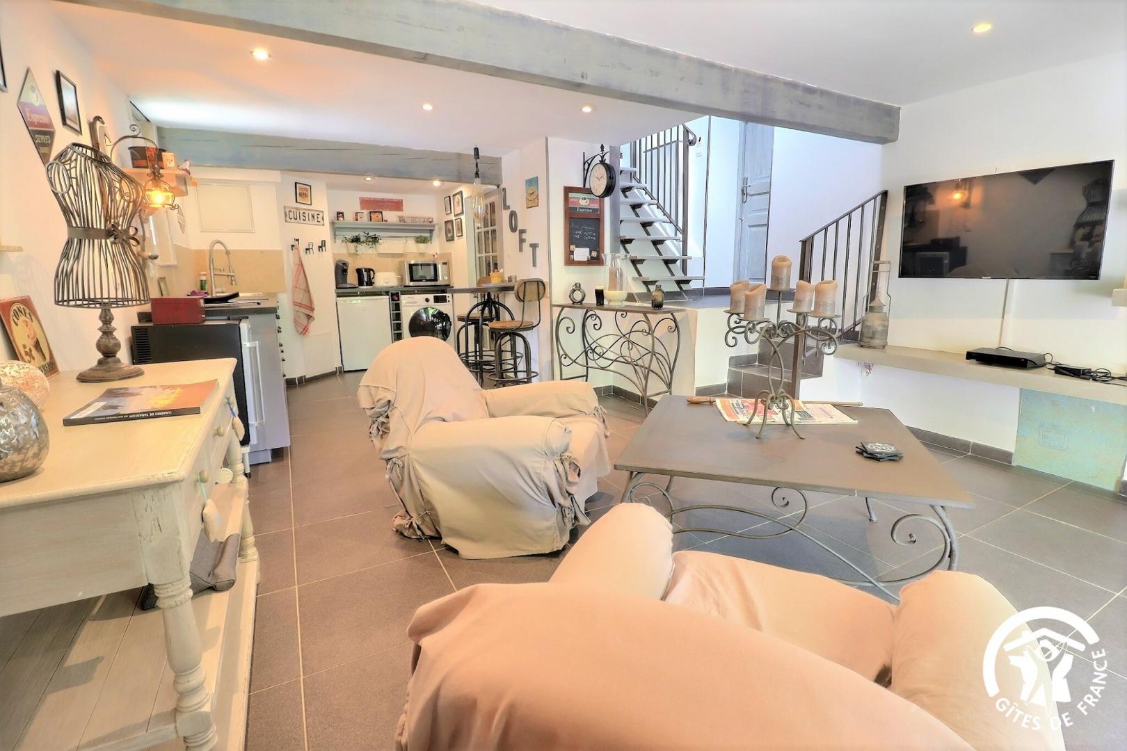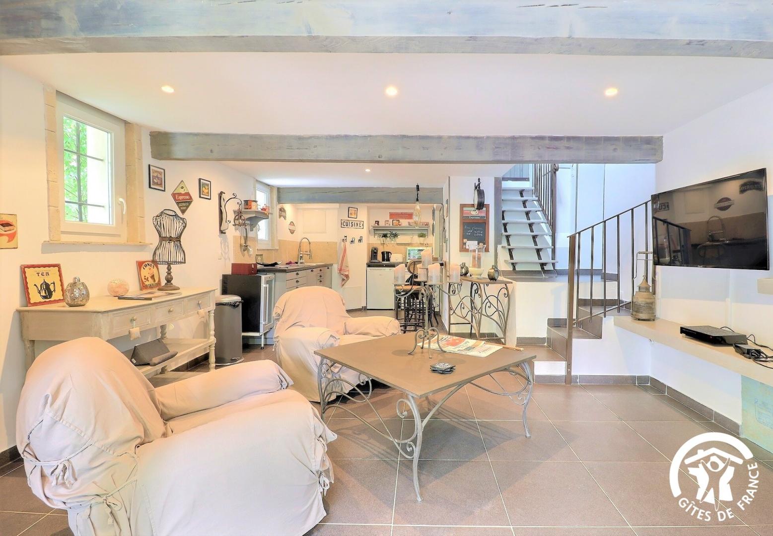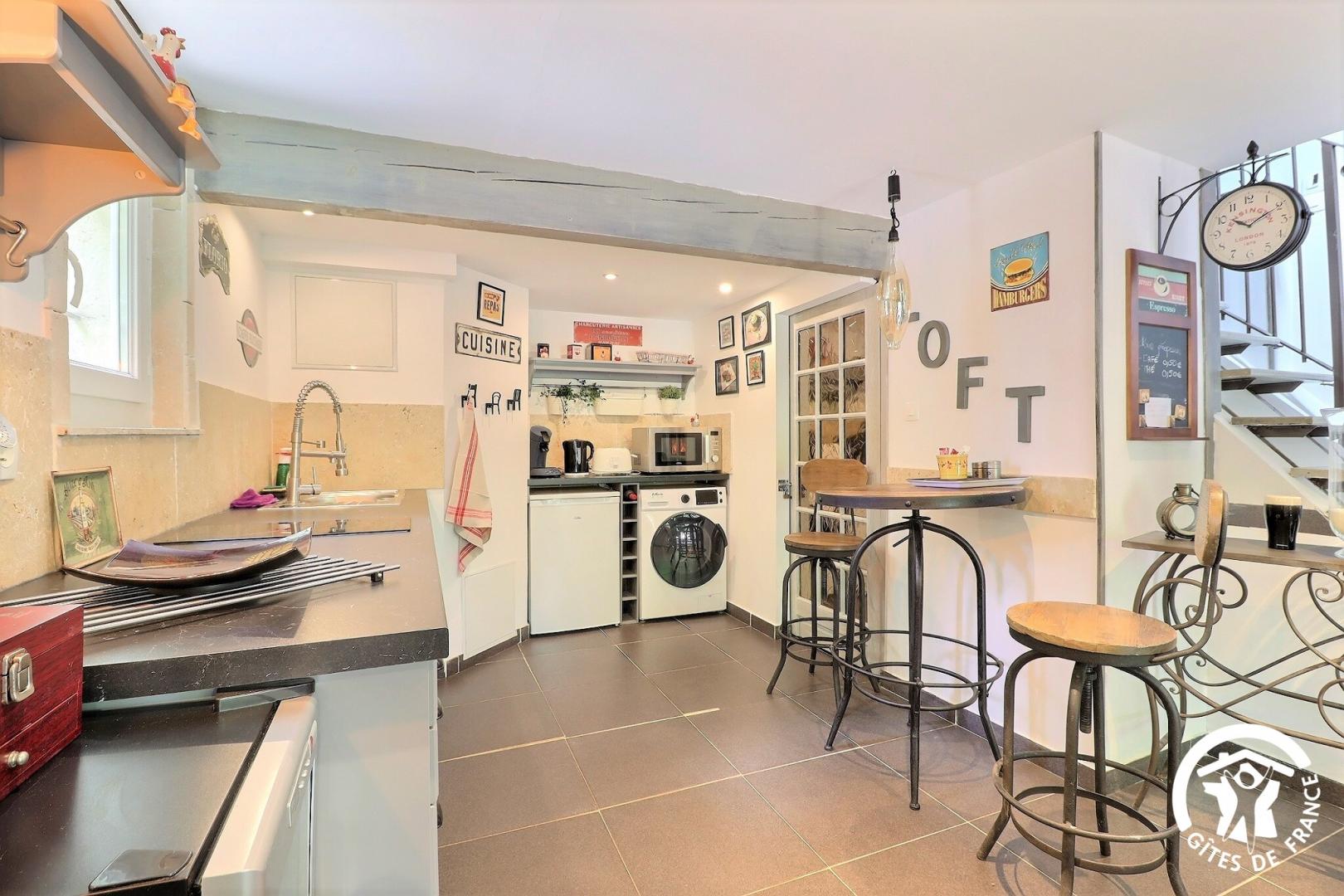 Au rez-de-chaussée, le gîte est composé d'un séjour avec fauteuils club, TV écran plat avec chaînes Freebox (accès Netflix, Youtube, etc...). Espace repas pour 2 personnes avec table et chaises hautes. Cuisine ouverte sur le séjour avec plaque 2 feux vitrocéramique, combiné micro-ondes/four, lave-linge, petit réfrigérateur et cave à vin.