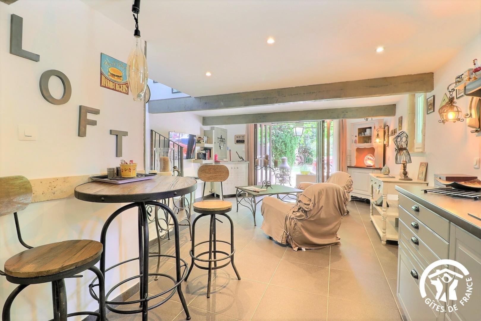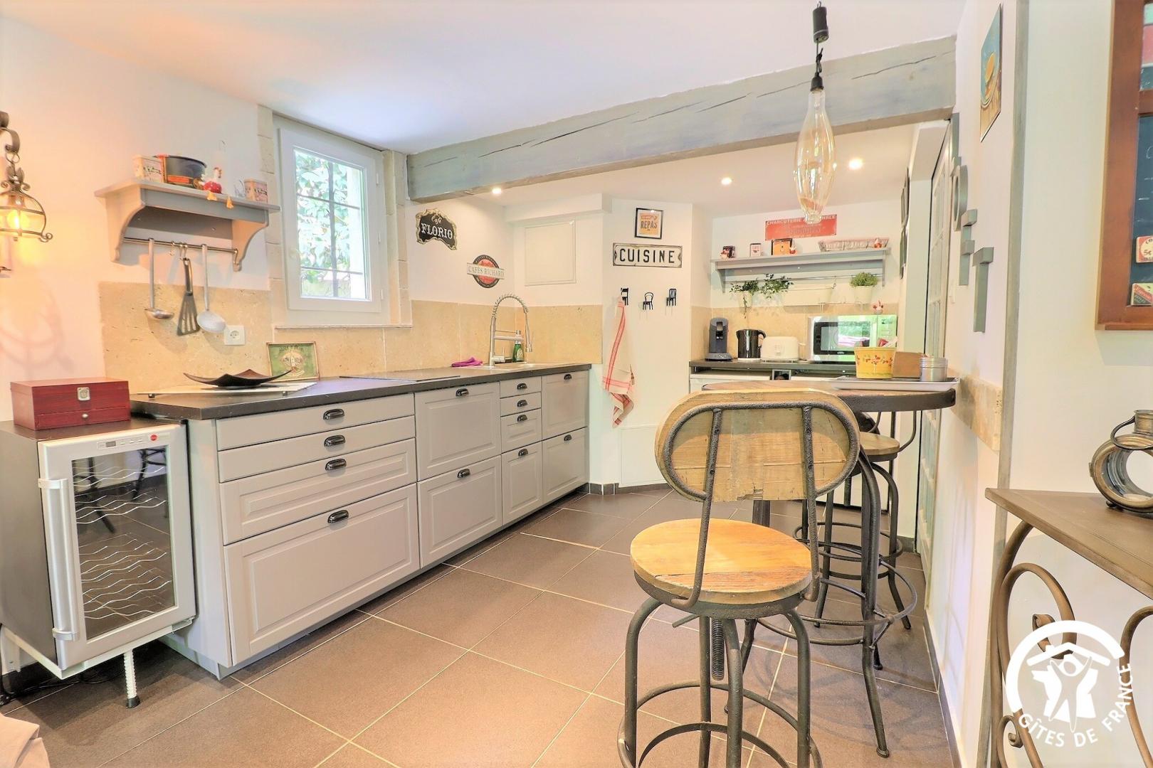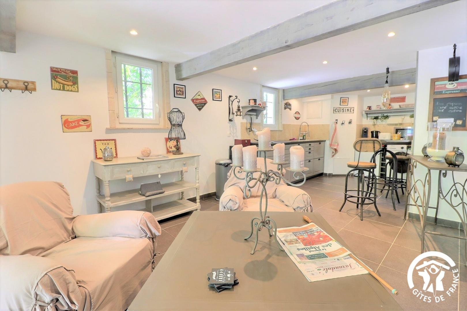 Au rez-de-chaussée, le gîte est composé d'un séjour avec fauteuils club, TV écran plat avec chaînes Freebox (accès Netflix, Youtube, etc...). Espace repas pour 2 personnes avec table et chaises hautes. Cuisine ouverte sur le séjour avec plaque 2 feux vitrocéramique, combiné micro-ondes/four, lave-linge, petit réfrigérateur et cave à vin.