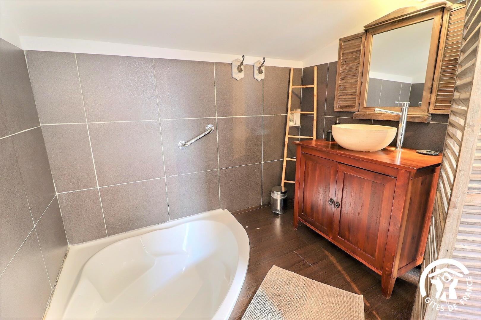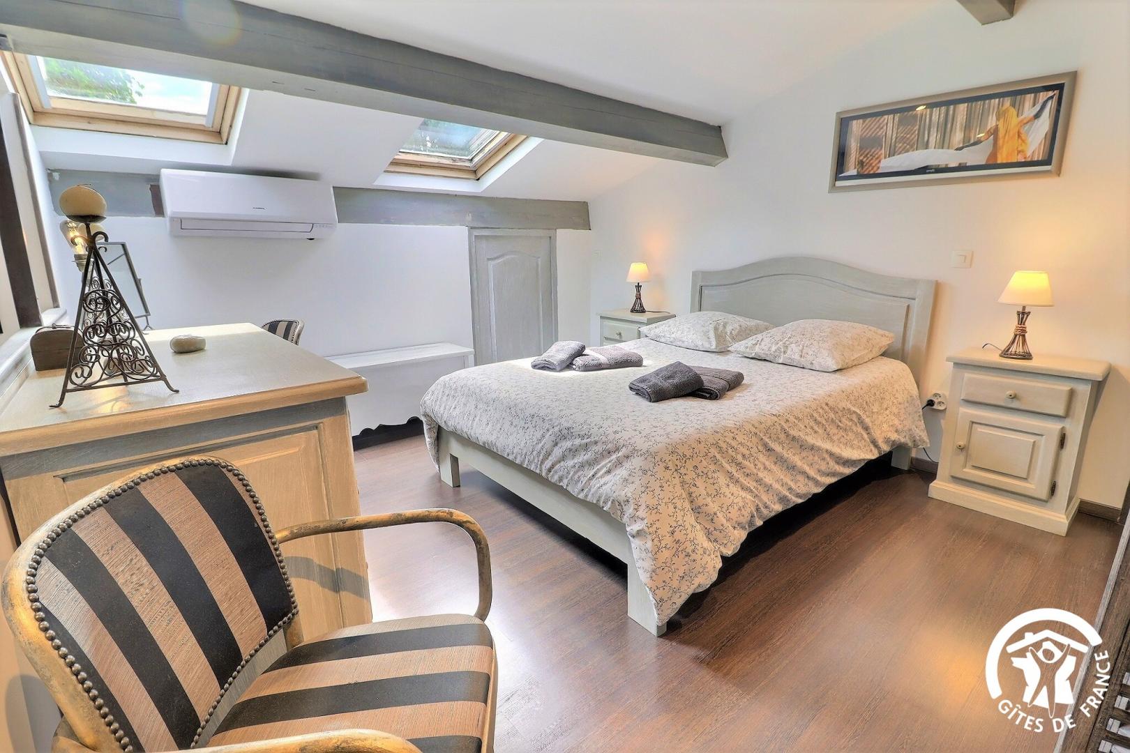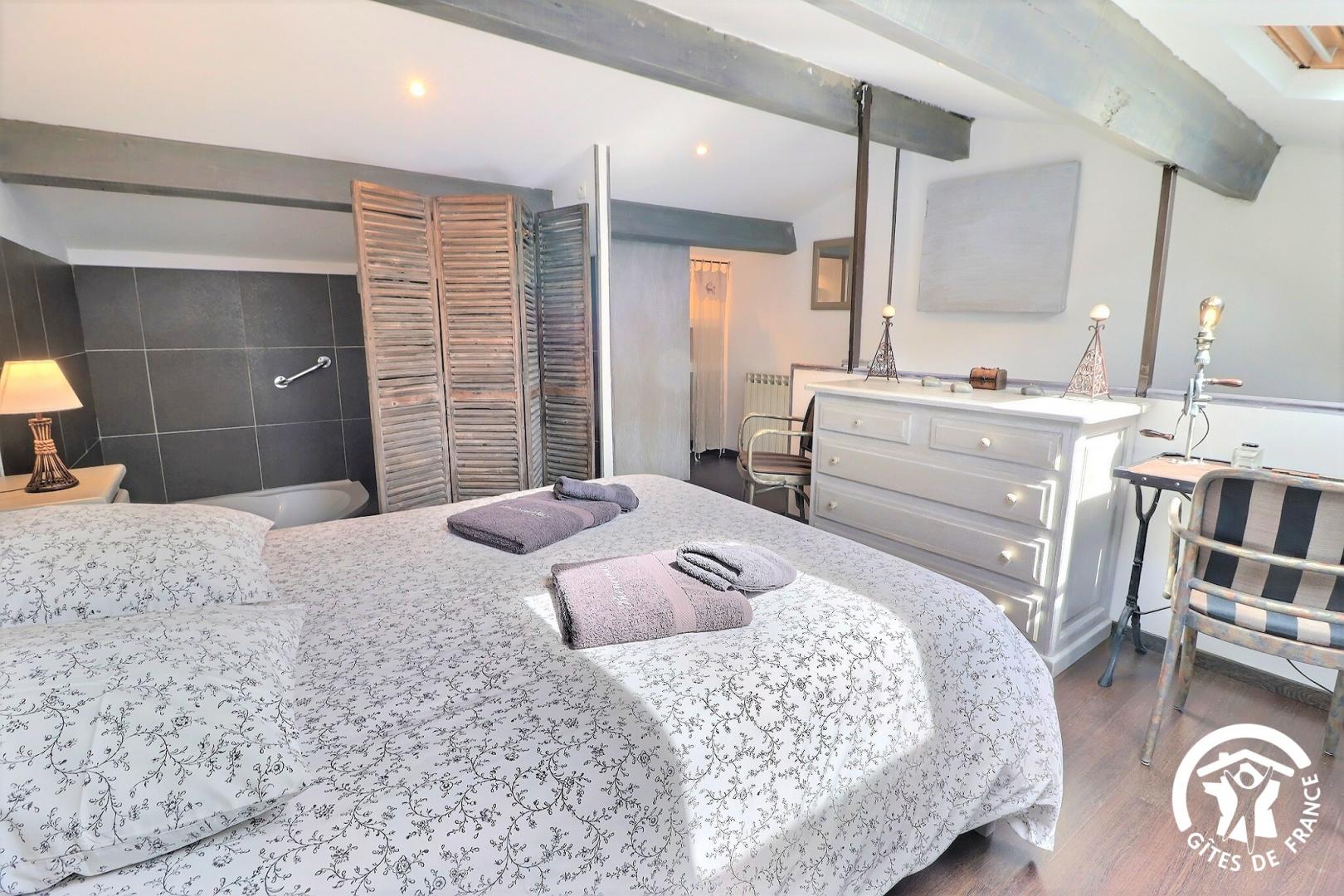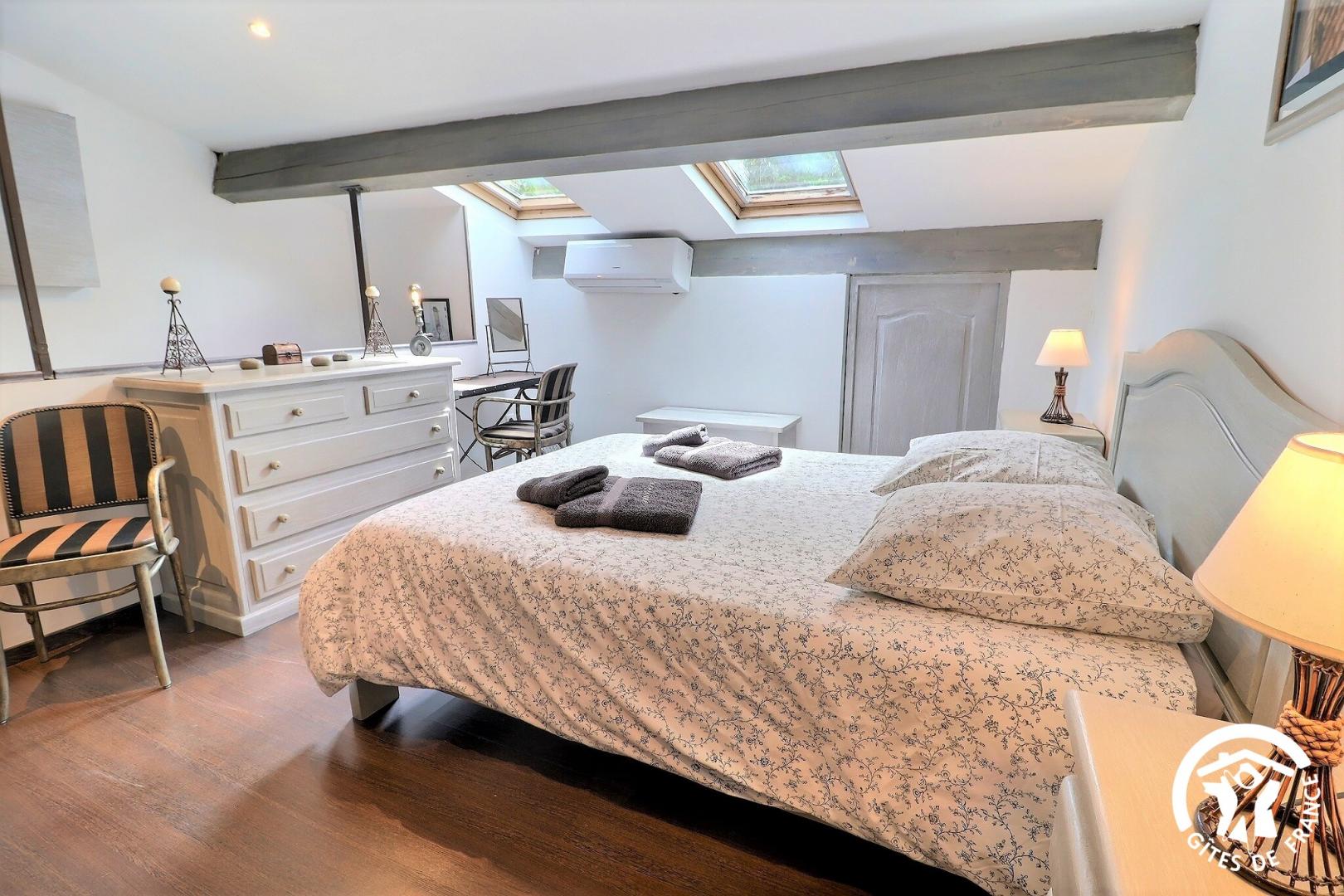 A l'étage, la chambre sur mezzanine fermée avec velux et climatisation réversible. 1 lit 2 personnes 140x200cm, bureau, espace de rangement avec étagères, commode et coffre. Coin salle de bain ouvert sur la chambre, avec baignoire encastrée, vasque et paravent. WC sanibroyeur fermé.