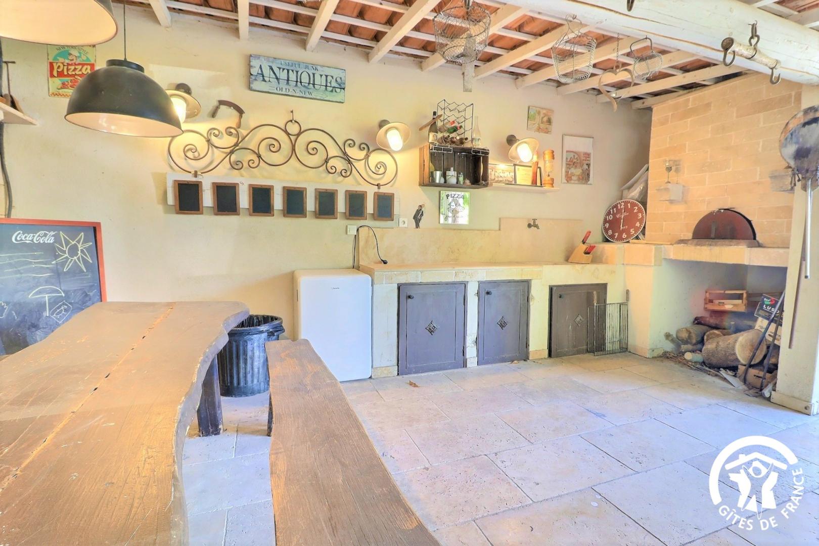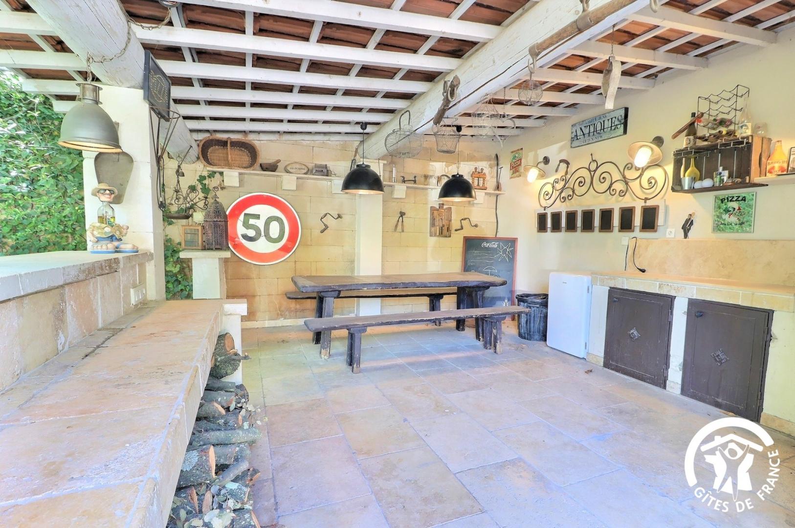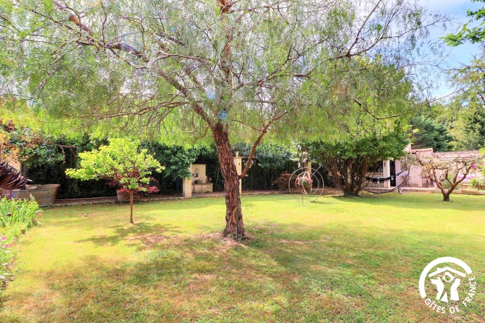 Belle terrasse ombragée privative de 15 m² avec fauteuils et braséro (bois fourni). Jardin partagé avec les propriétaires d'environ 600 m², fleuri et verdoyant. Pool house avec grand espace repas et four à pizza / barbecue.
