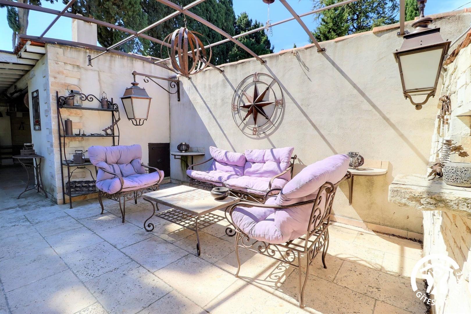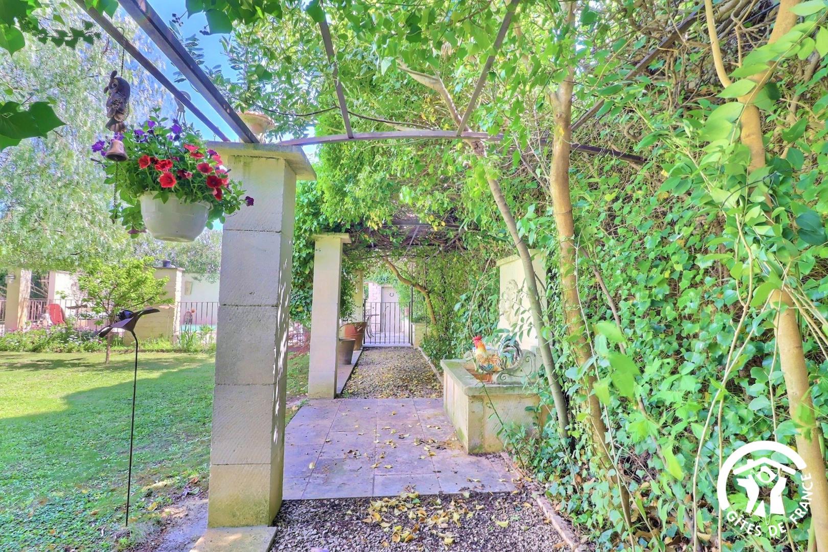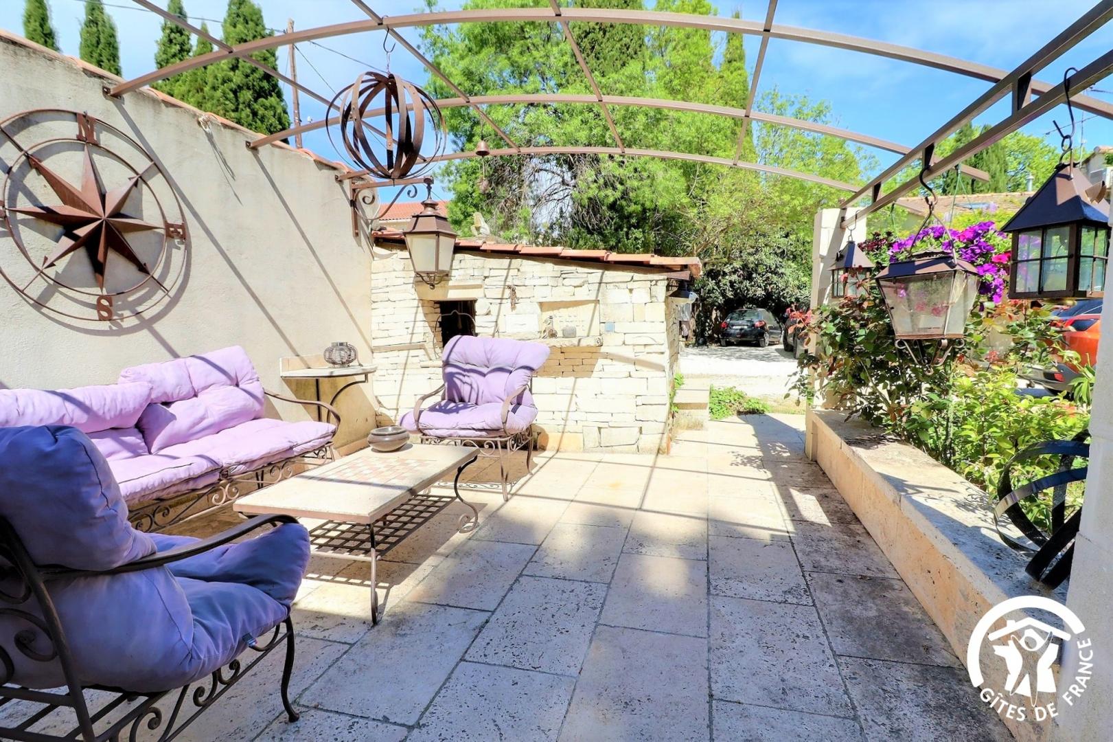 Belle terrasse ombragée privative de 15 m² avec fauteuils et braséro (bois fourni). Jardin partagé avec les propriétaires d'environ 600 m², fleuri et verdoyant. Pool house avec grand espace repas et four à pizza / barbecue.