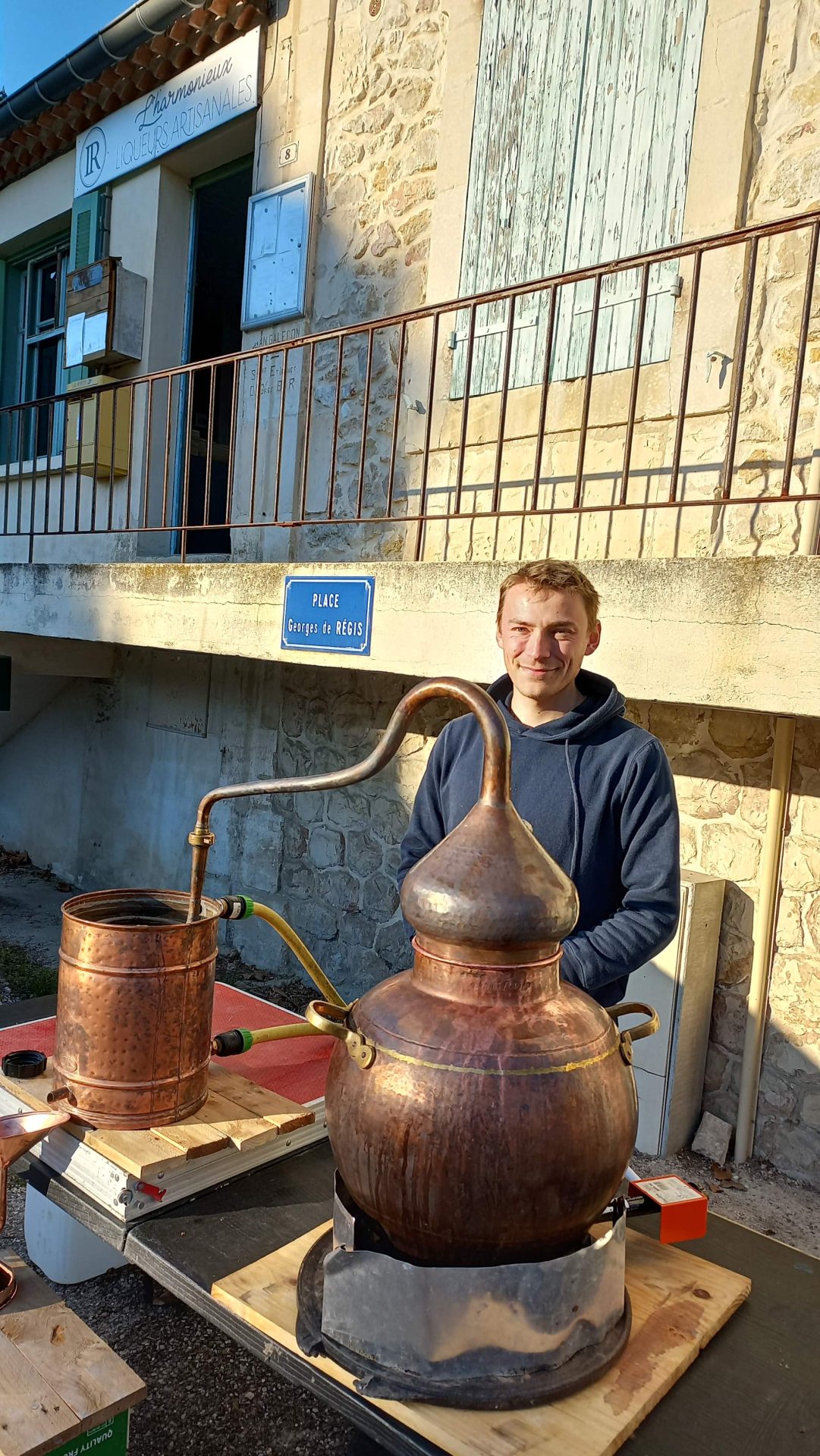A une centaine de mètres de la mairie, je débouche sur la place Georges de Régis, au croisement des chemins vers Boulbon à l’Est, Vallabrègues à l’ouest. Sur une table de fortune est posé un drôle d’appareil en cuivre, comme une énorme théière reliée à une cuve par un tuyau. Un alambic… Robin Raoux est en train de faire de l’alcool de pomme. Étonnant. Je me sens projetée dans un temps ancien, fort lointain, ou nos aïeux savaient prendre le temps. Car il en faut du temps pour distiller les fruits qui bouillonnent lentement dans la marmite tout en laissant s’échapper des effluves fruités. Des heures…