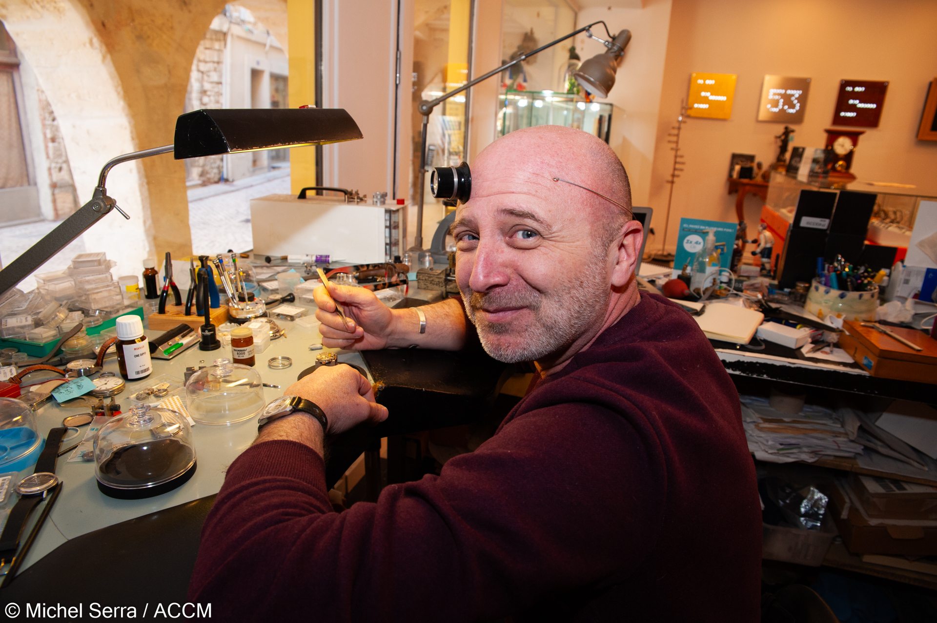 Il est 9h, mercredi matin. Tarascon s’éveille avec douceur entre odeurs de croissants et effluves de café. La rue des Halles, centre névralgique du commerce et de l’artisanat de la commune, est encore calme. Quelques habitants vaquent à leurs occupations matinales, deux ou trois touristes feuillètent déjà des livres en libre disposition à la cabane des livres place xxx. Face à un artisan-peintre et juste à côté d’une bijoutière et d’une boutique de produits bio en vrac, vous trouverez Olivier Jonquet, rhabilleur horloger passionné.