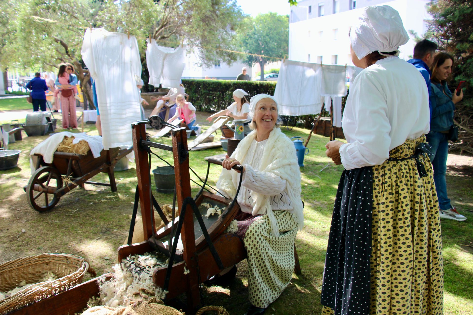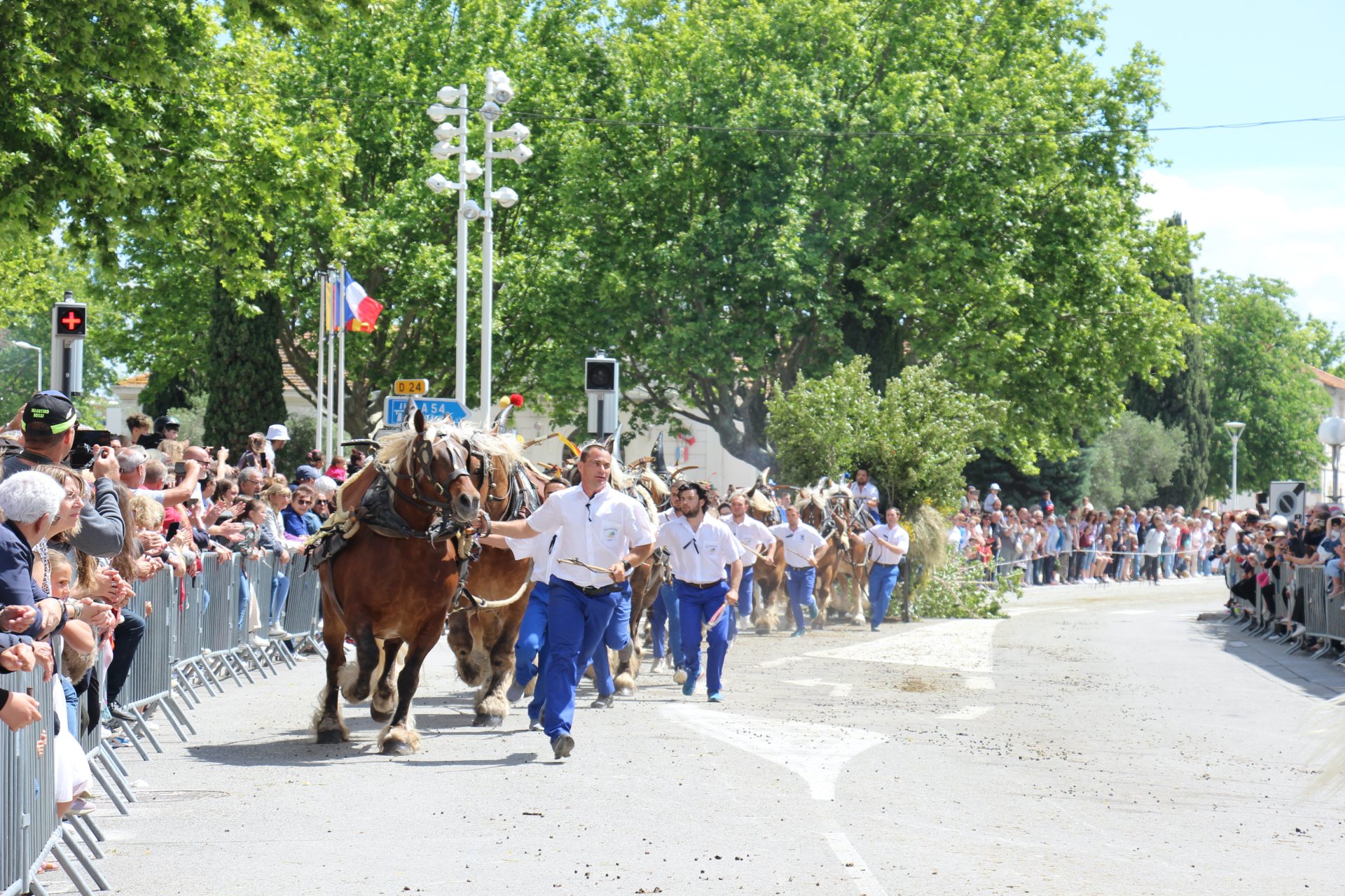 Dans les rues de Saint-Martin de Crau le passé se mêle au présent. Le dimanche de la fête, plusieurs personnes costumées en habit d’époque investissent le parvis de la mairie. On retrouve un maître d’école qui vous invite à faire une dictée, une cardeuse qui travaille la laine, une confiturière qui fait mijoter, dans un chaudron, des fraises dont le parfum ravit de bons souvenirs d’enfance… Tout près de là, j’entends un bruit métallique et vois un maréchal-ferrant ferrer un cheval et attiser la curiosité des passants émerveillés par la scène. Je poursuis ma balade et profite du joli marché provençal installé dans l’avenue principale pour acheter de bons produits locaux et de l’ombre d’un parasol de la terrasse d’un bar, pour prendre un café en attendant le grand défilé, autre temps fort de cette fête.