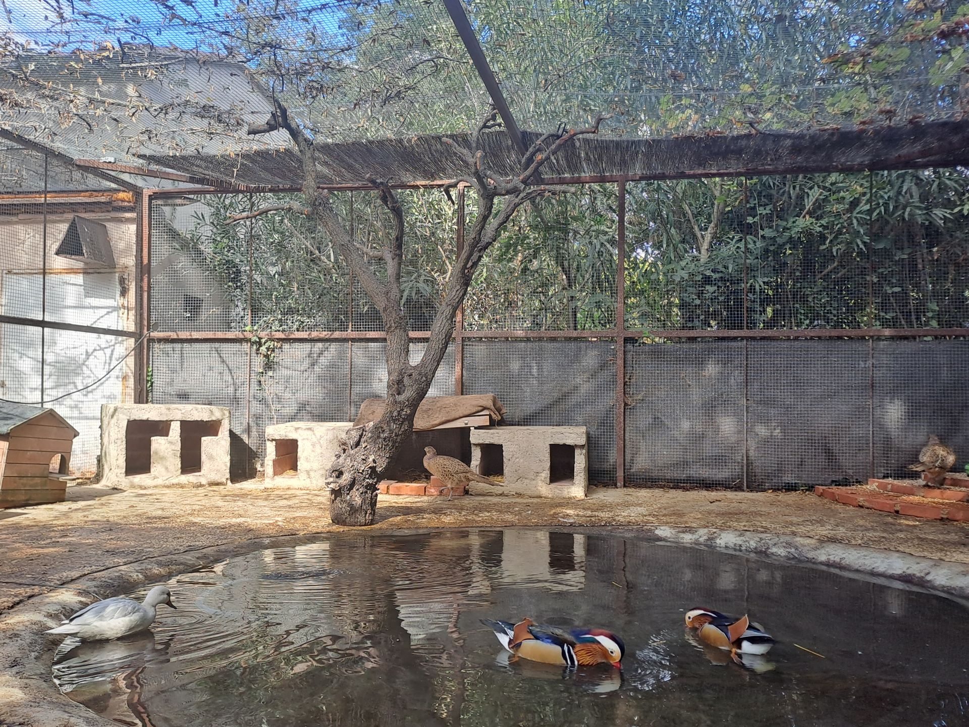 Nous sommes au début de l’automne et je décide de me rendre dans ce jardin un jeudi après-midi pour promener et prendre quelques photos. Sur le parking, plusieurs voitures sont garées ce qui m’étonne assez pour un jour de semaine. Il est 14 heures, il fait 26°C et je pénètre sous une voute arborée qui semble me couper du monde extérieur. Ça y est, l’heure est à la découverte, j’entame ma balade en longeant un petit canal où j’aperçois quelques colverts qui semblent m’indiquer le chemin. Je décide de poursuivre sur ma gauche et j’arrive à hauteur de plusieurs volières. Des colombes, des pigeons, des faisans, des tourterelles, des canards et de magnifiques paons blancs sont répartis par affinité. Je vois passer à quelques mètres de moi une dizaine de petits coqs en liberté qui semblent m’interpeler et qui me suivent quelques secondes.