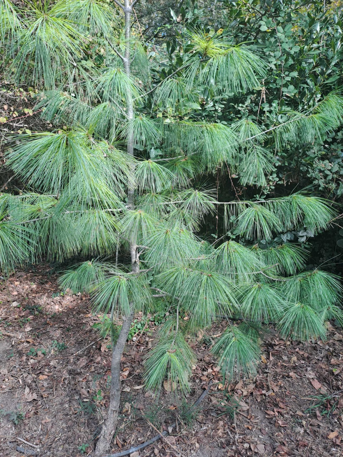 Direction la sortie, je passe une petite passerelle en bois, par un nouveau chemin et m’arrête à hauteur d’un arbre qui a quelque chose d’original, des aiguilles en forme de pompons, oui vous savez, comme ceux des « pom pom girls » qui supportent leur équipe de football américain, hormis qu’ils sont plus petits et tous verts. Je lis le panonceau piqué à ses pieds et je découvre qu’il s’agit d’un Pin pleureur de l’Himalaya, un arbre au port particulier, en pyramide large, avec des branches présentes sur toute la hauteur. Il peut atteindre 40 m, parfois plus, dans sa zone d’origine. Les fleurs apparaissent en avril mai et figurez-vous que les fleurs mâles sont de coloration différente des femelles.