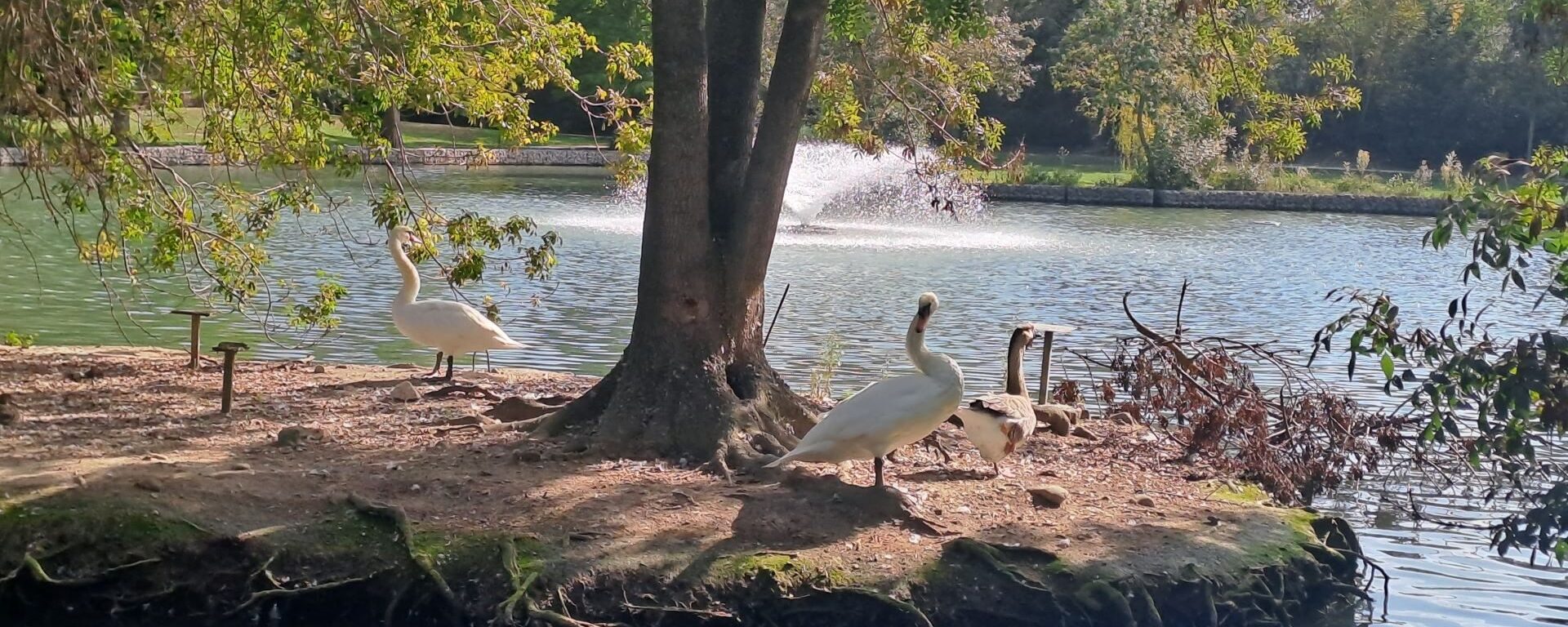 Je continue à me balader et j’arrive au cœur du jardin où je surplombe un très joli petit lac. Je distingue des canards, une oie et deux magnifiques cygnes blancs qui se reposent, un peu en retrait, sur un îlot. Je les observe et pense qu’ils doivent être drôlement bien ici ! Je prends quelques photos et m’assoit sur un banc pour me poser et regarder en détail tout ce qui m’entoure et je me rends compte que l’environnement dans lequel je me trouve est agréablement silencieux. J’apprécie ce silence qui détend, qui donne un côté paisible au lieu et je savoure ce moment de pur bonheur avec en bruit de fond les gazouillis des oiseaux, le cancanement des canards ou encore le cacardement de l’oie. Je décide d’aller voir ce qui se cache un peu plus loin, le chemin que j’emprunte est éclairé de-ci de-là par les rayons du soleil qui percent les feuillages.